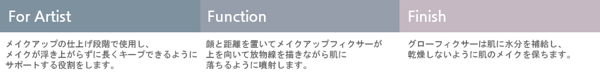 たっぷりの水分でお肌に素早くフィットし、メイクをナチュラルに固定しキープしてくれます。