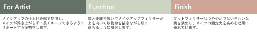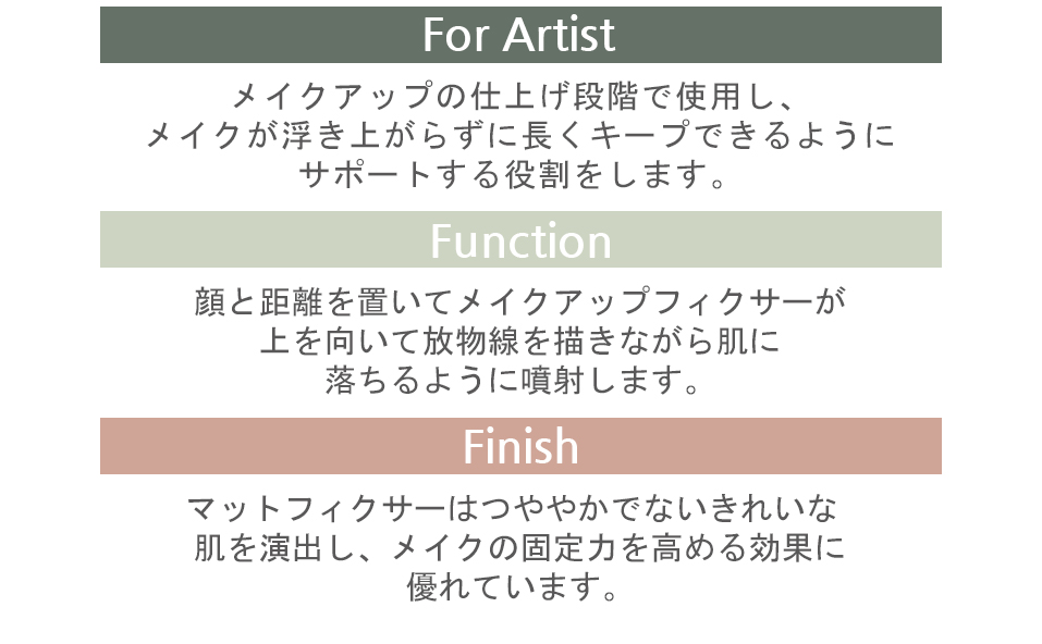 パウダリーですべすべしたベースメイクをした後、マットフィクサーを噴射してかけると、すべすべ感が長持ちし、メイクの固定力を高めます。