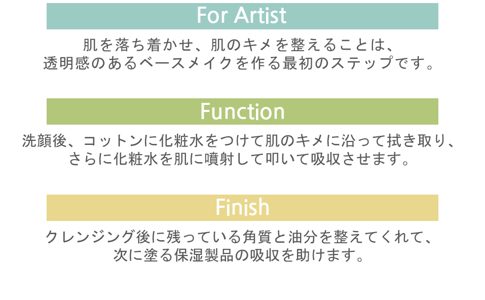 - 香り高くほのかなトナーの香りは、メイクを受けながら全体的なリラックスができるようにします。